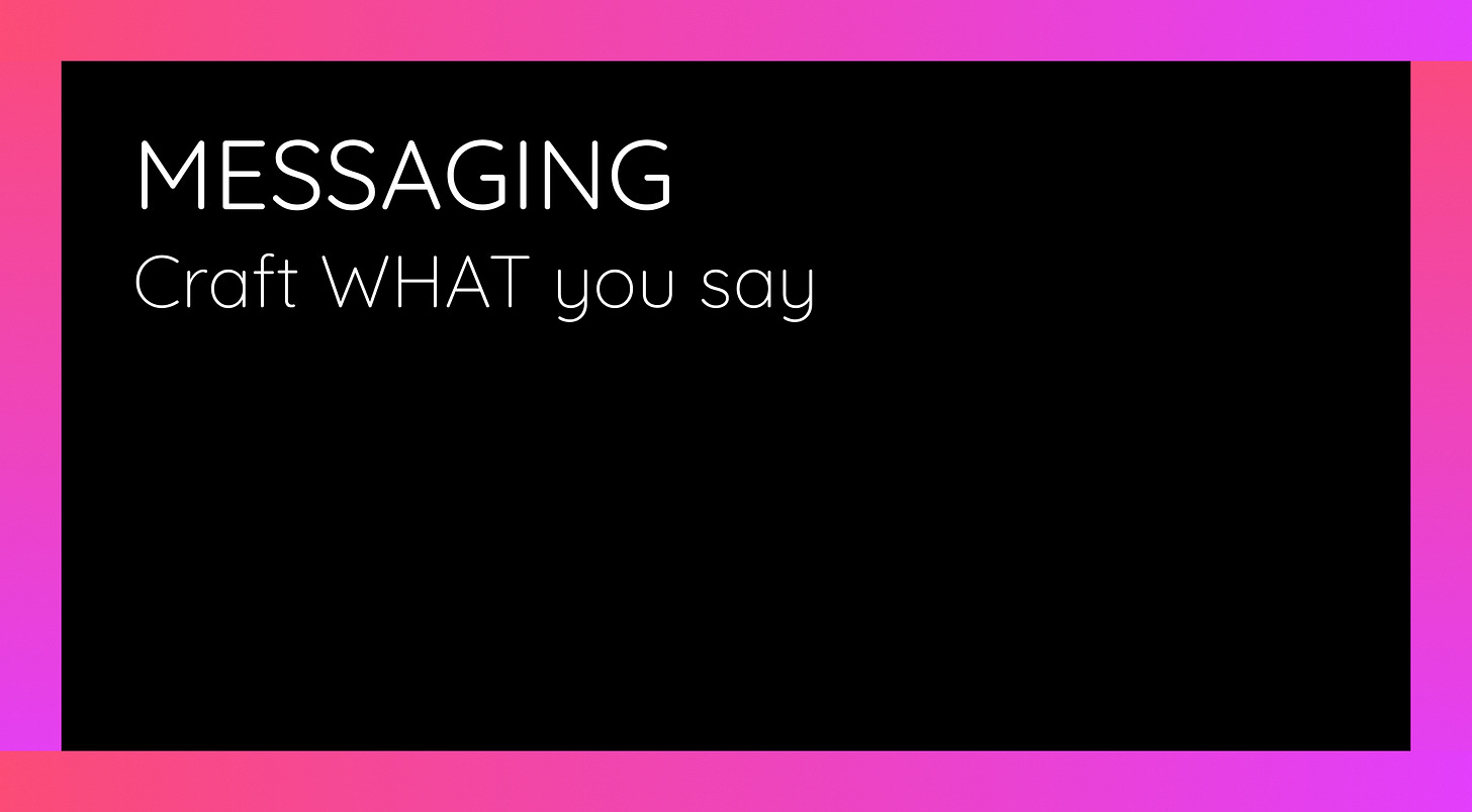 Messaging includes the narratives, value propositions, and language used to communicate your positioning to specific audiences.